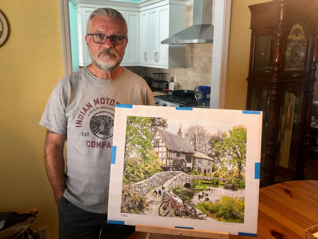 I can imagine walking over this bridge. It’s a cool scene with the dog and bike and the ducks in the water. 16″ x 20″ acrylic on canvas.