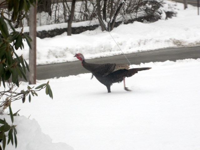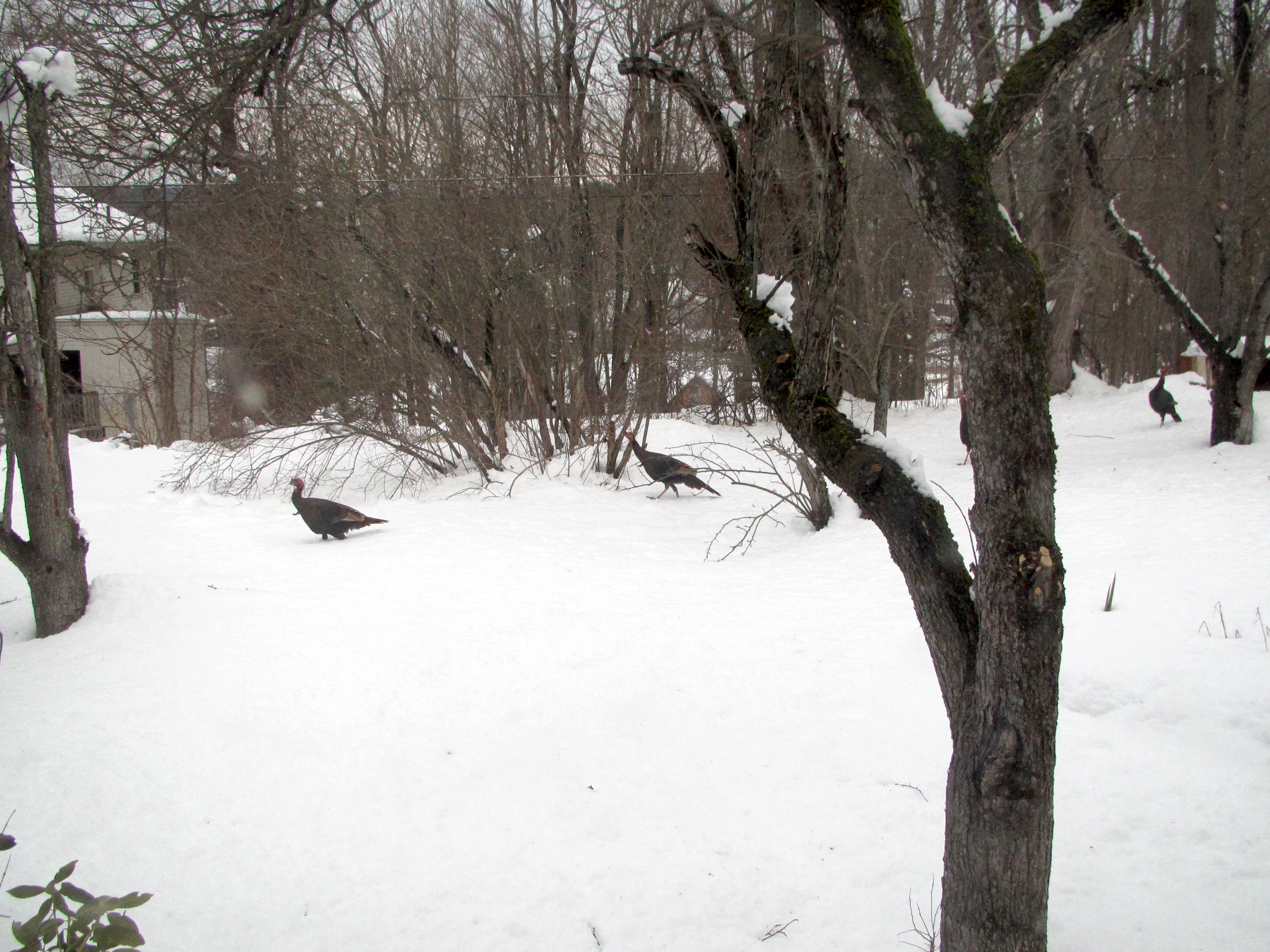The turkeys pretty much follow each other in a straight line. They were taking a shortcut from one side of our property to the other side. Plodding through the snow.