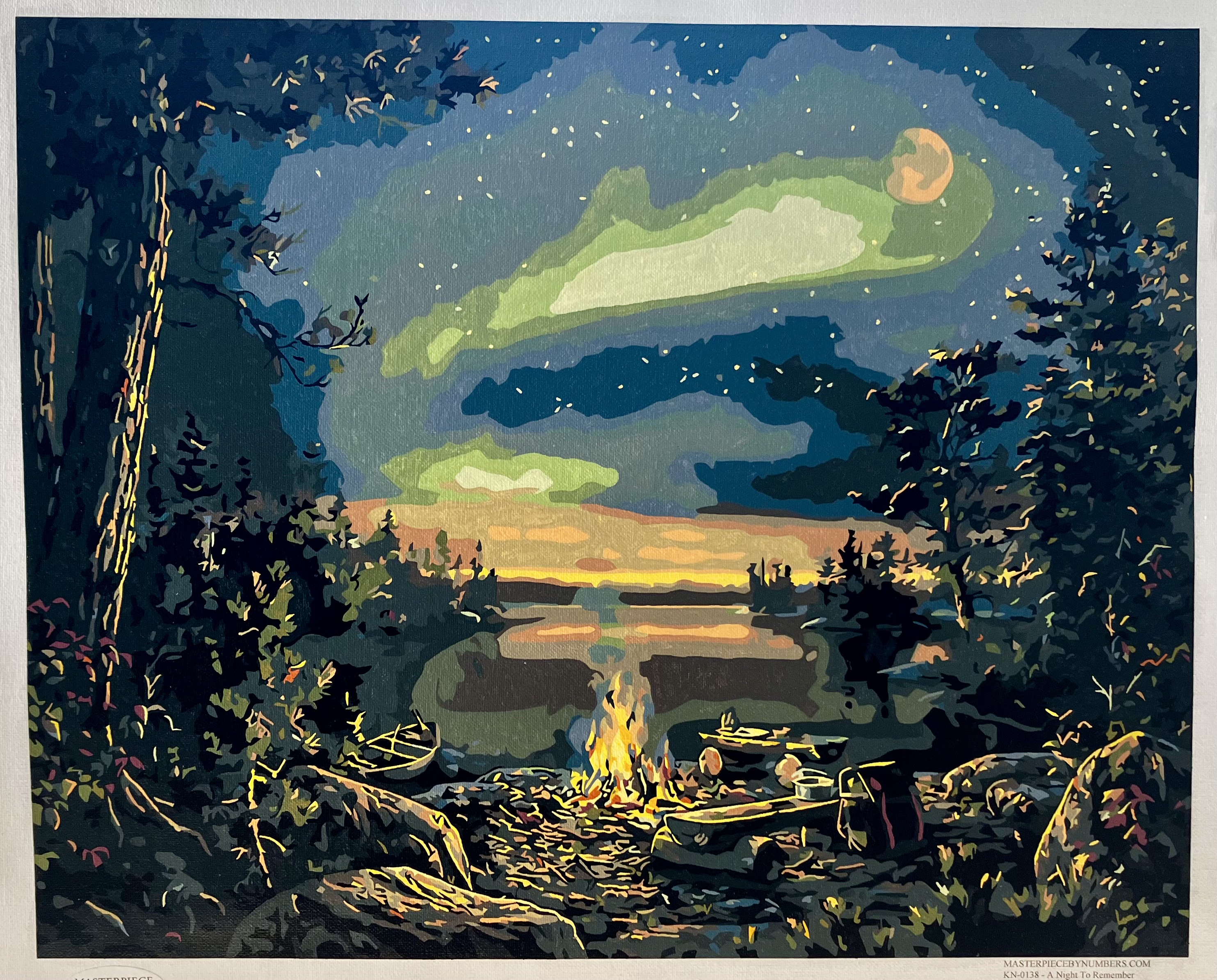 This was painting number 13. A lot of dark colors when I started, but gradually the highlights appeared. The fireplace glows. It’s a cool scene. I can imagine the sound of the fire and the crickets. Maybe even some loon calls from the lake.