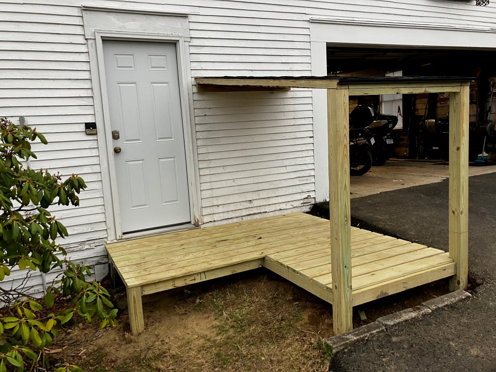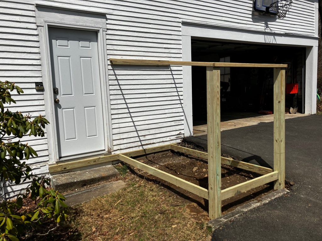 Prior to building the shelter, I was making do with loading the firewood onto a couple of old pallets and then covering the firewood with a tarp. I had it set up in the same place and it was convenient to retrieve the wood from there, but tarps are messy. The snow and rain makes winter access to the wood annoying. Also, I wanted to build a small landing by the side door. The existing poured concrete steps there had started to sink over time.