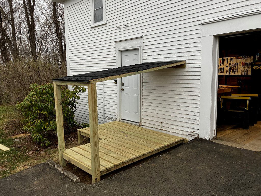 Then I added the platform and the roof. I used similar asphalt roof tiles to match the color of the tiles on the carriage house. The cross beams under the platform had additional support from some concrete building blocks. A cord of wood can weigh 3,000 to 5,000 pounds depending on the species of wood and moisture content. I wanted the platform to be very sturdy.