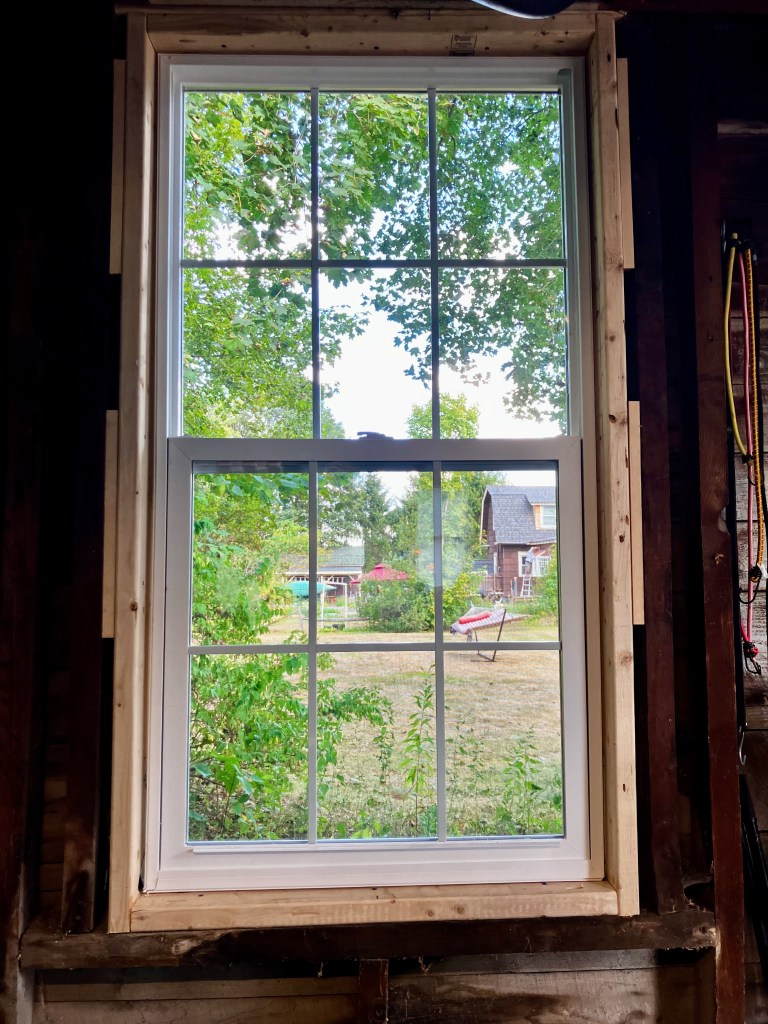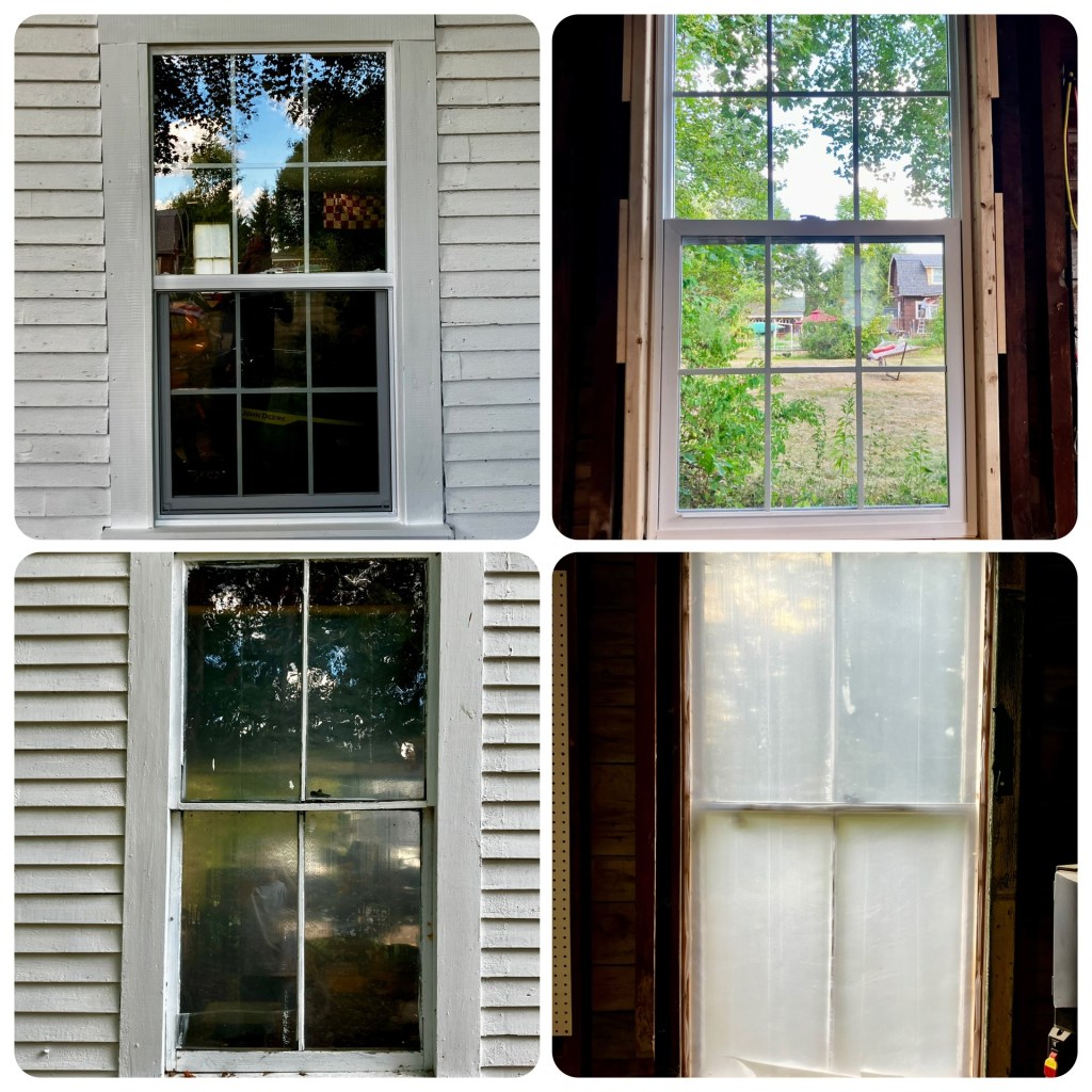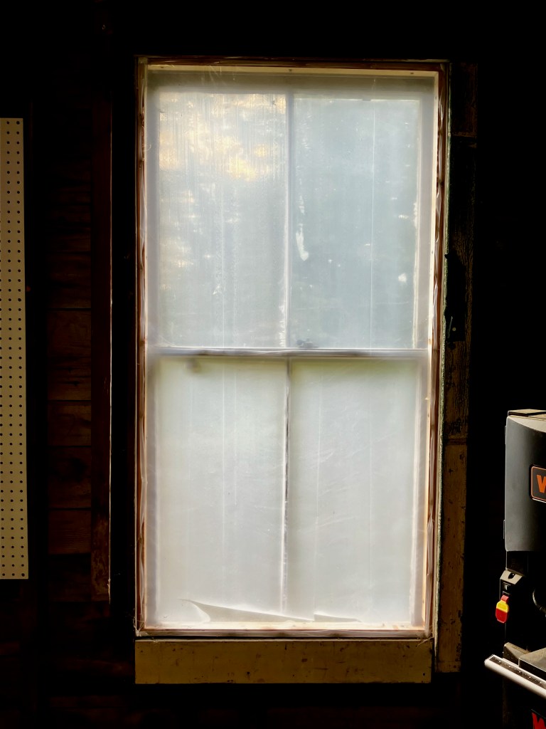The existing windows are old and falling apart. When we bought the house in 2022, I noticed that some of the glass was broken in some of them as well. I temporarily closed them off using plastic sheeting and wood on the inside to prevent the wind and rain from getting in.