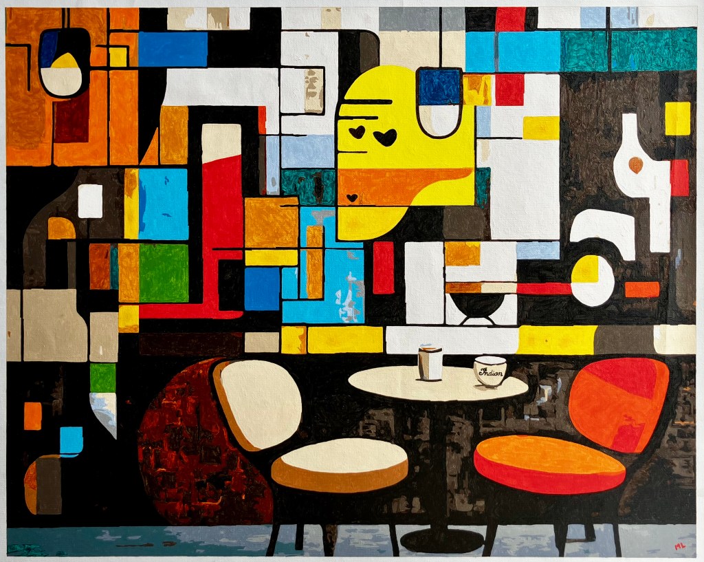 Another 16″ x 20″ or 40cm x 50cm. Acrylic on canvas. I like the geometric shapes and colors in this painting. We put it up in the kitchen by the coffee machines. The perfect spot for it.