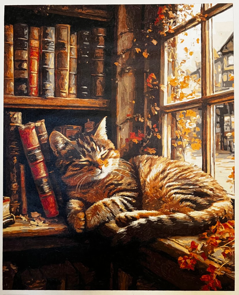 Another 16″ x 20″ or 40cm x 50cm. Acrylic on canvas. After painting Coffee Break with its geometric shapes, I decided to switch the theme. I like cats and books. This was fun to paint. It reminds me of our cat Pepper.